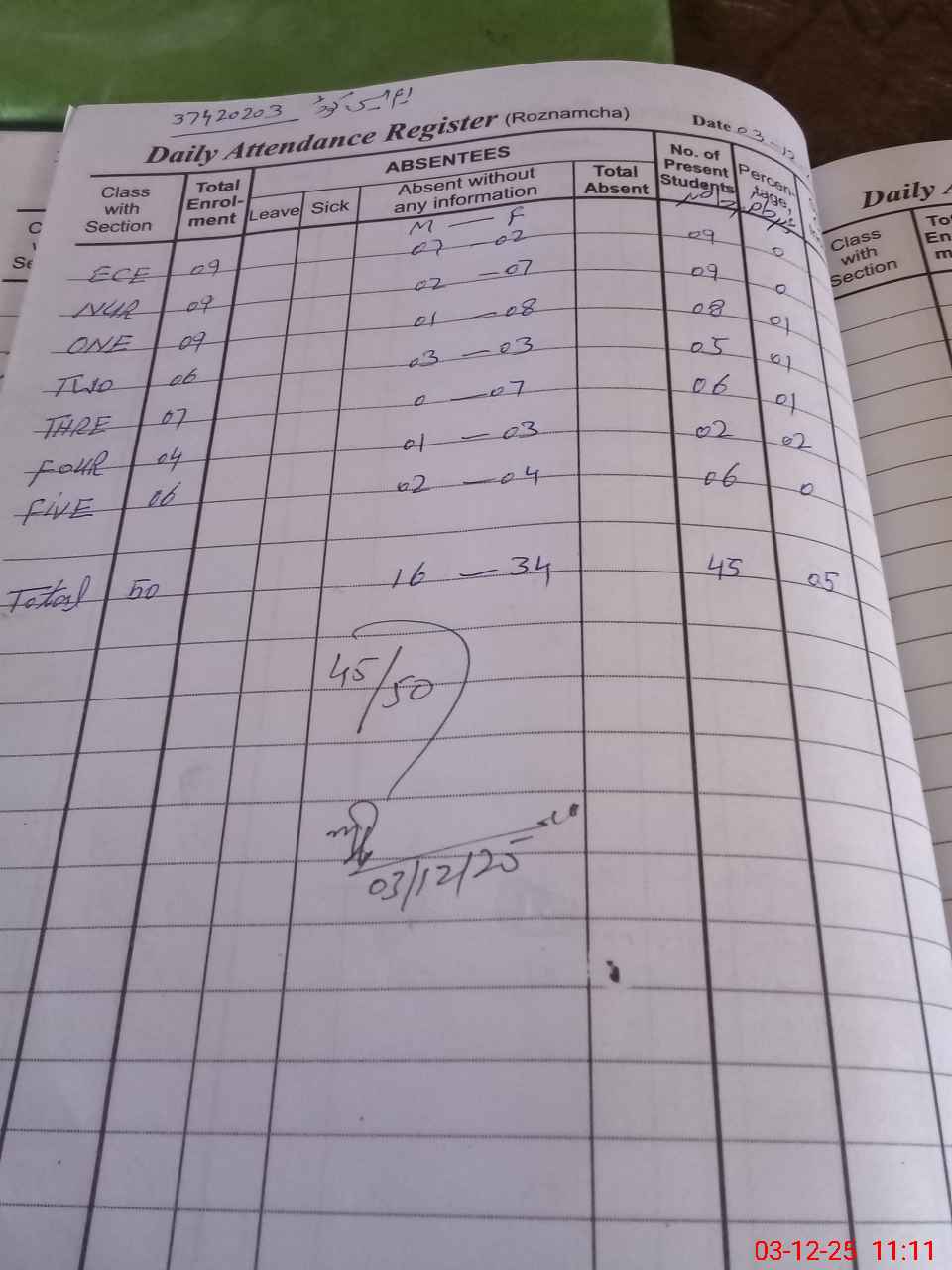 | No. of Students Present - Female | 0 | 2 | 7 | 3 | 6 | 1 | 4 | 30 | ||||||||