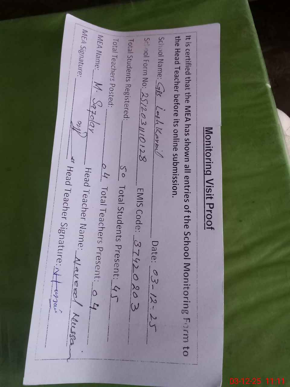 | Attendance Register | Head Teacher | MEA with School | Visit Proof |