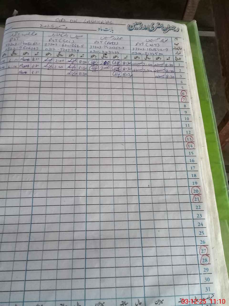 | CNIC | Full Name | Designation | R/C | Absence During Last Calender Month |