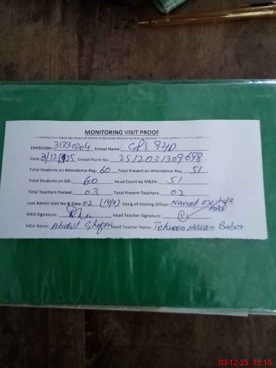 | Attendance Register | Head Teacher | MEA with School | Visit Proof |
