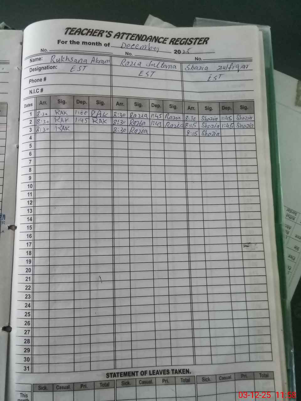 | 33**** | Ma**** Iq**** | ESE Science | Contract | 0 | 0 | 0 | 0 | 0 | 0 | 0 | 0 | 0 | Absent (Un-Authorized) |