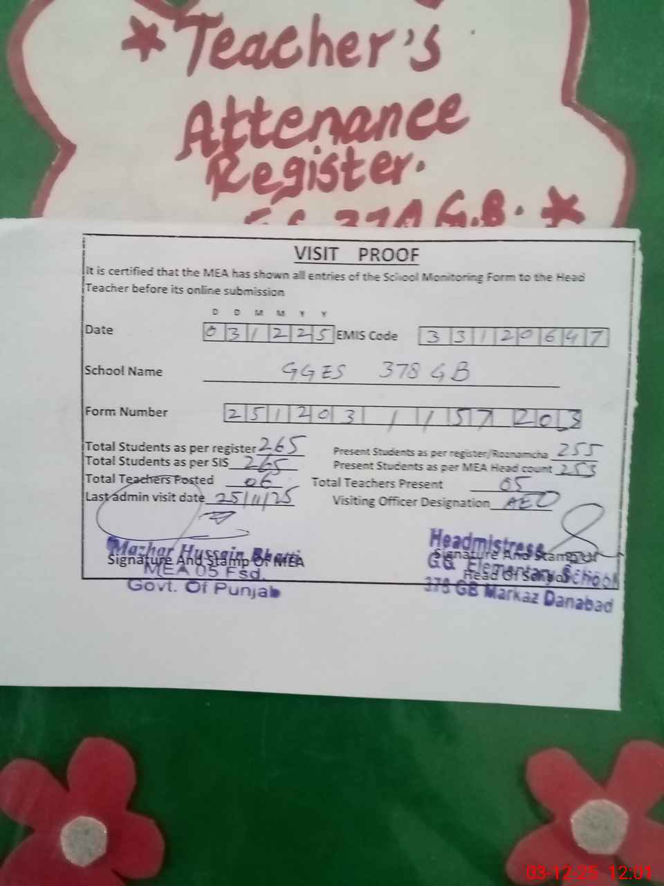 | Attendance Register | Head Teacher | MEA with School | Visit Proof |