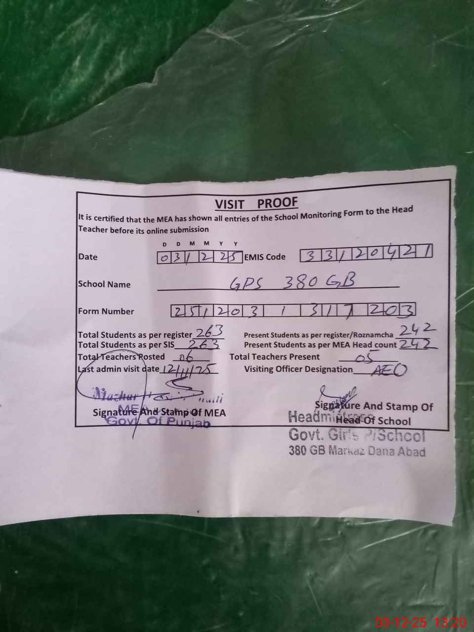 | EMIS Code: 33120421 | Name of School: GGPS CHAK 380 GB LUNDIANWALA | |||