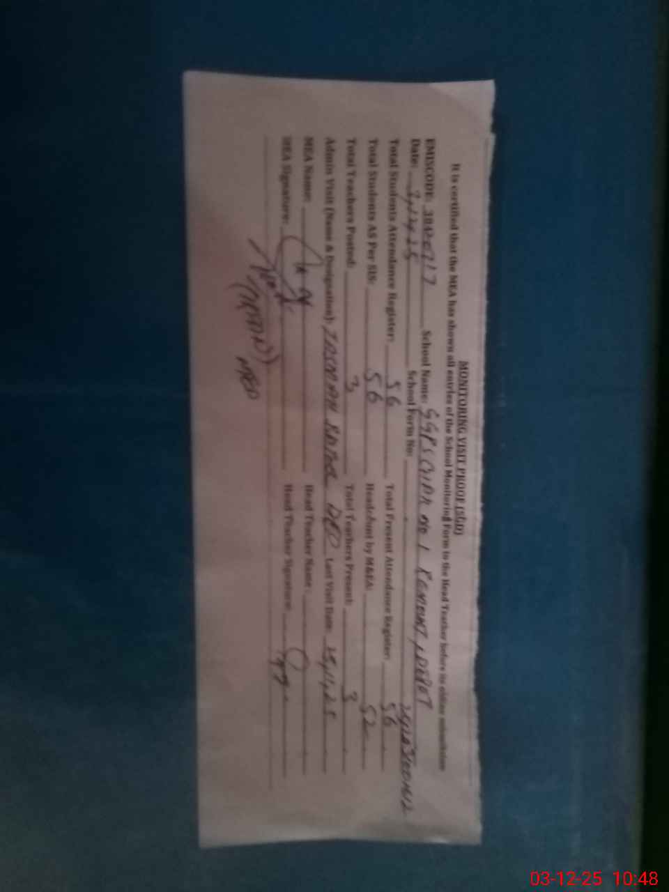 | Attendance Register | Head Teacher | MEA with School | Visit Proof |