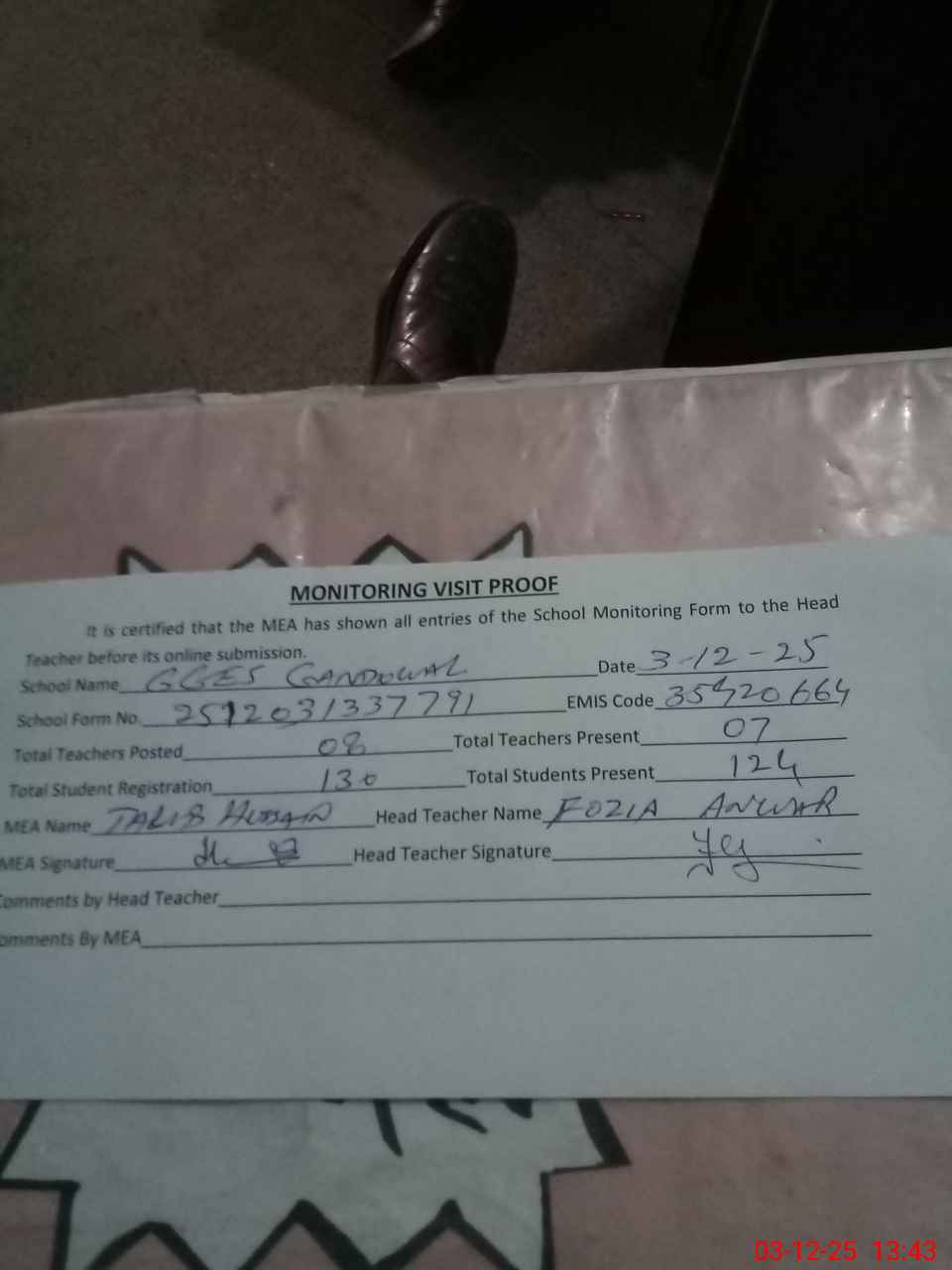 | Attendance Register | Head Teacher | MEA with School | Visit Proof |
