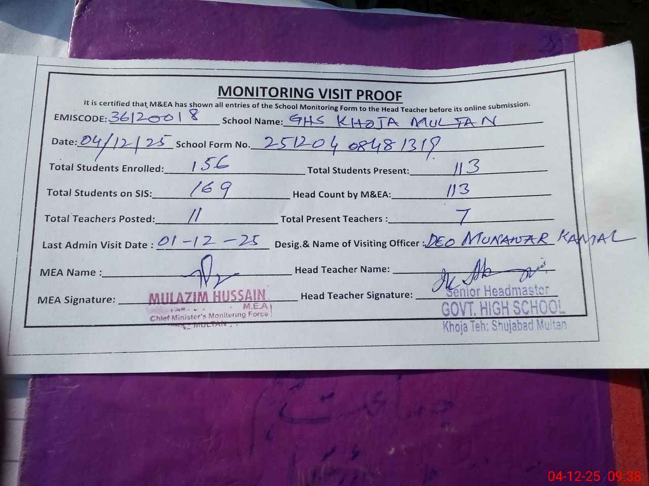 | Attendance Register | Head Teacher | MEA with School | Visit Proof |