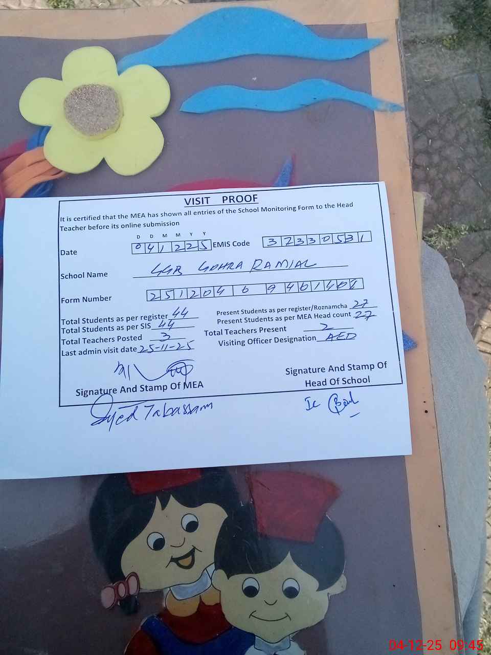 | Attendance Register | Head Teacher | MEA with School | Visit Proof |
