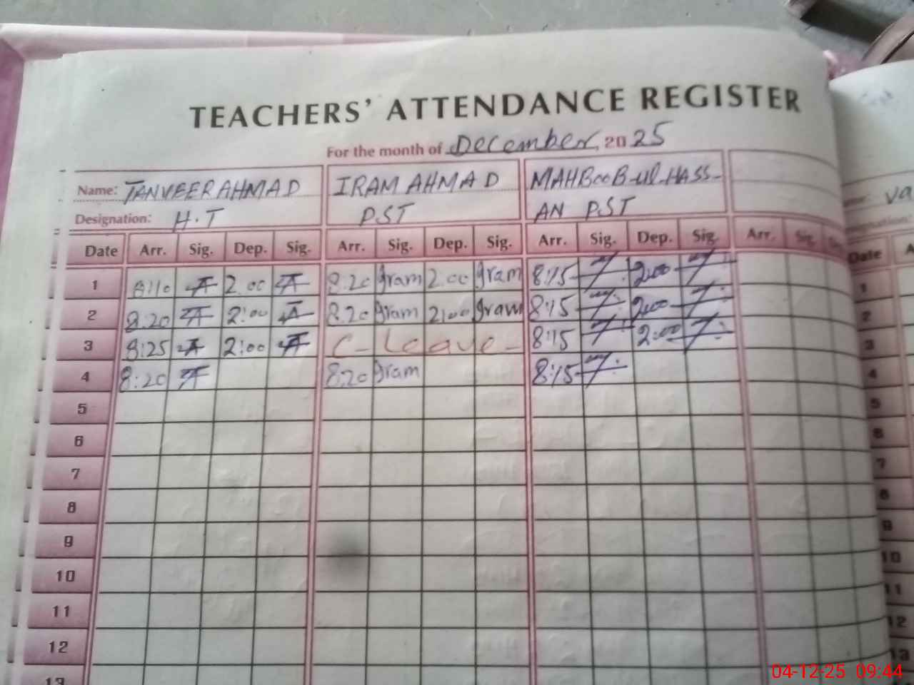 | CNIC | Full Name | Designation | R/C | Absence During Last Calender Month |