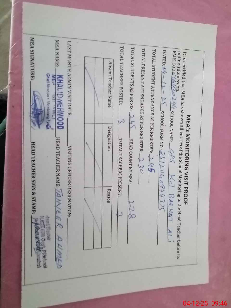 | Attendance Register | Head Teacher | MEA with School | Visit Proof |
