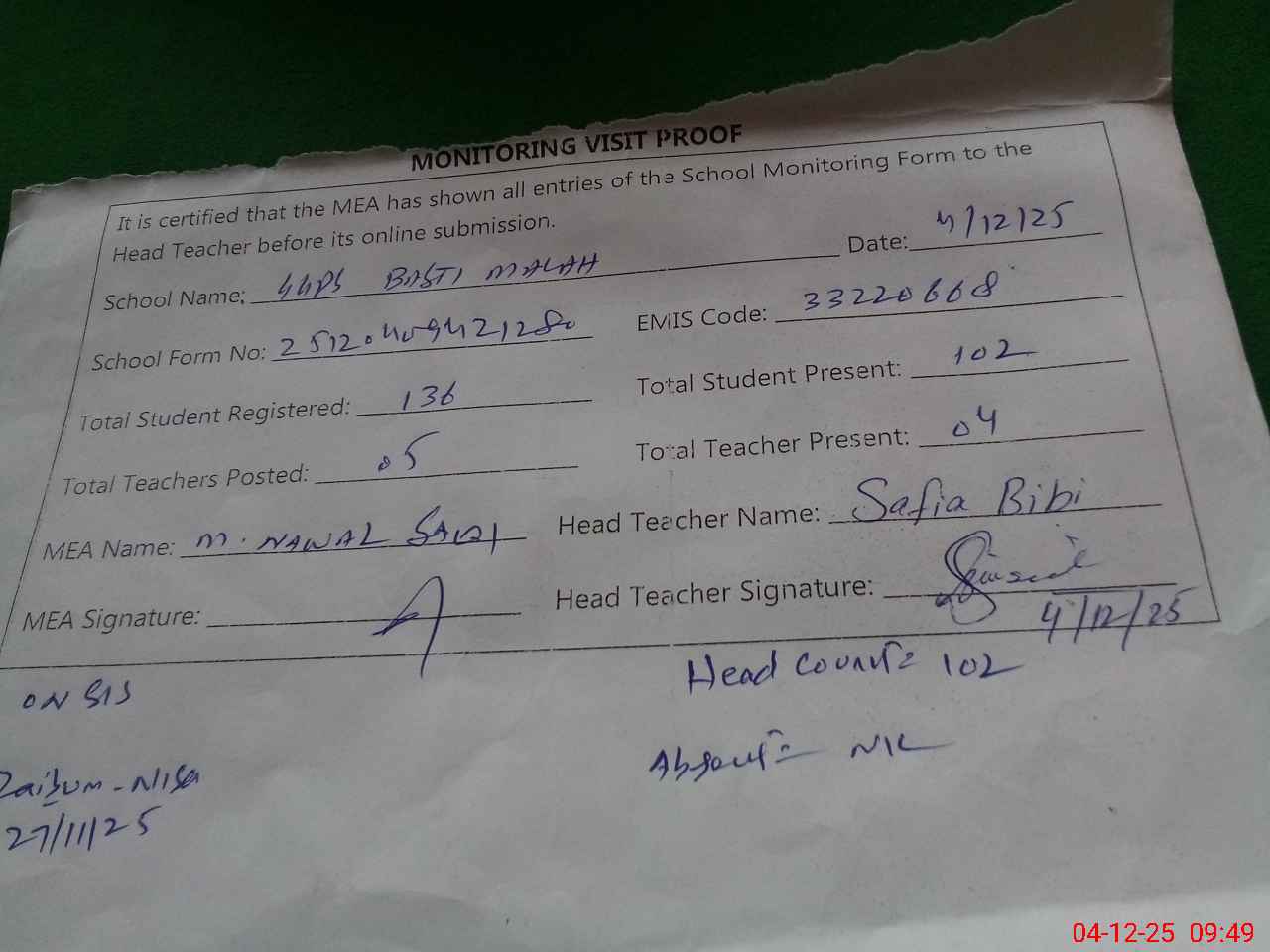 | Attendance Register | Head Teacher | MEA with School | Visit Proof |