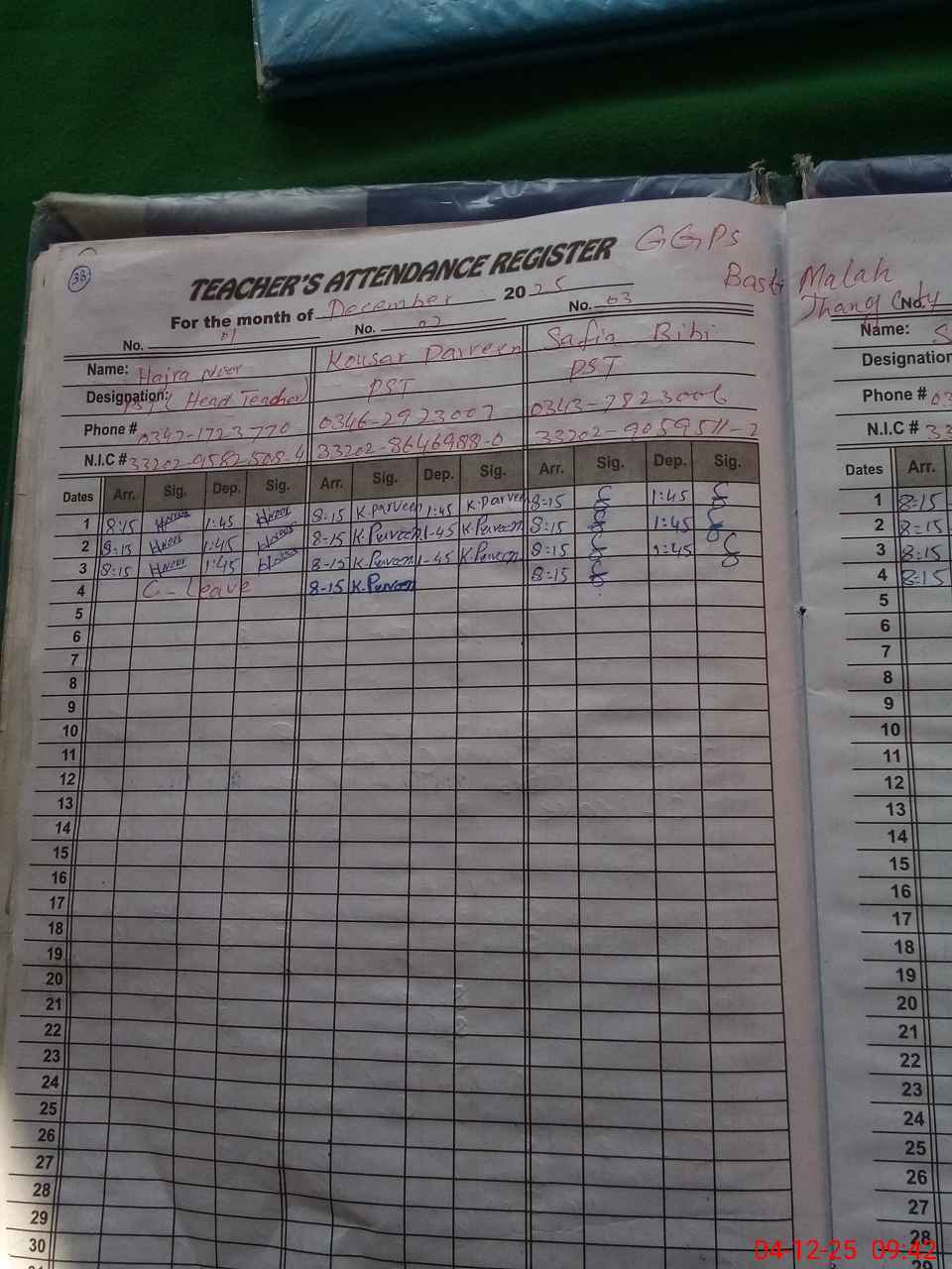| CNIC | Full Name | Designation | R/C | Absence During Last Calender Month |