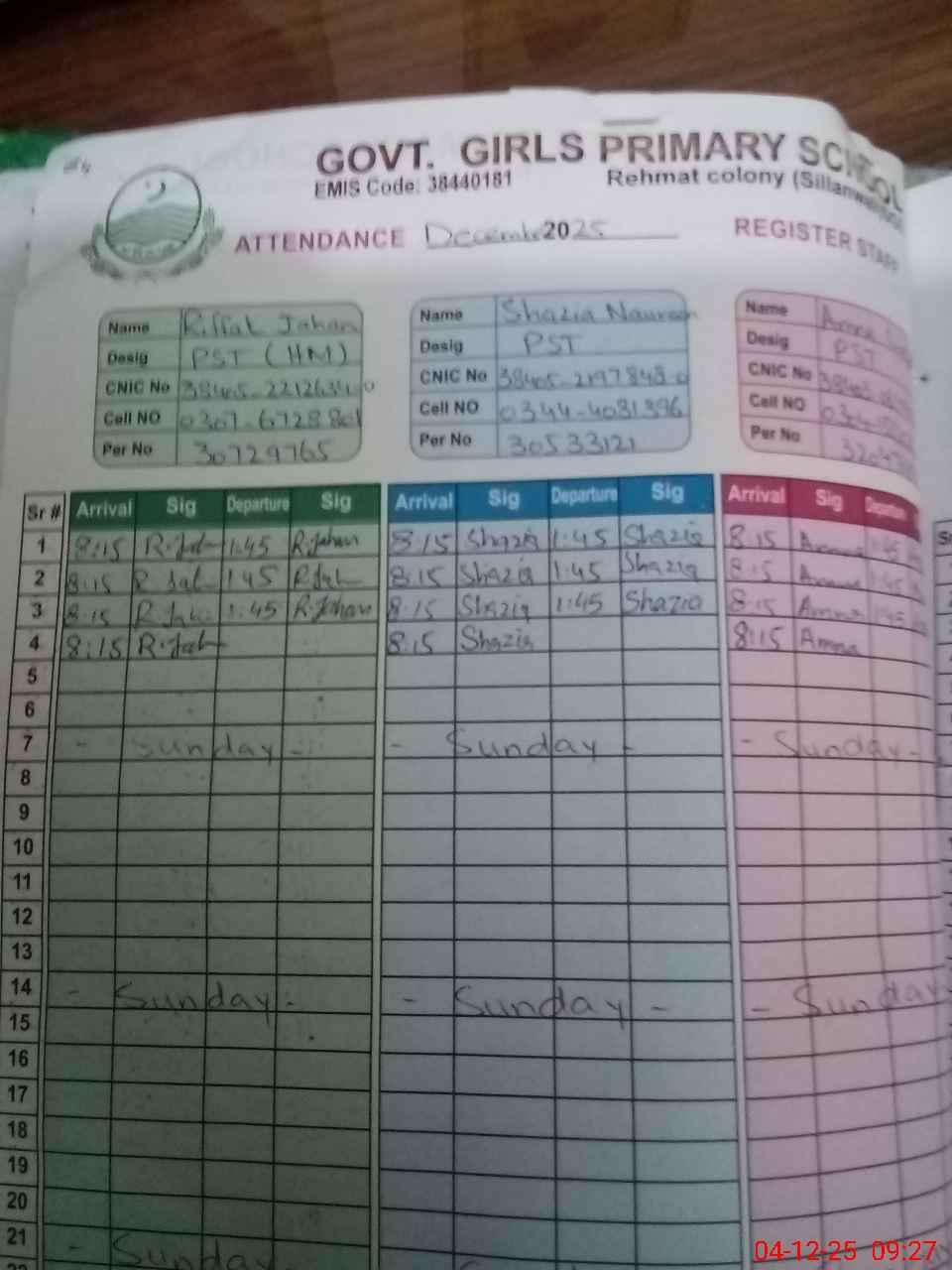 | CNIC | Full Name | Designation | R/C | Absence During Last Calender Month |