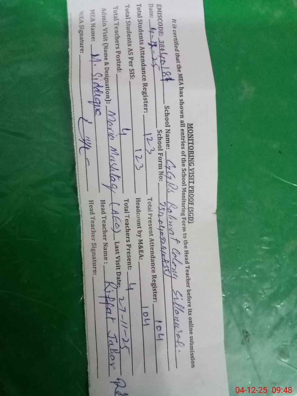| Attendance Register | Head Teacher | MEA with School | Visit Proof |
