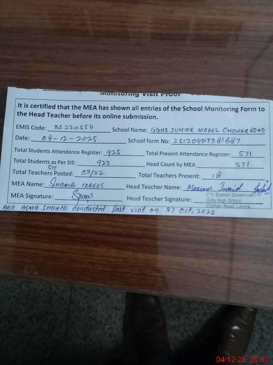 | Attendance Register | Head Teacher | MEA with School | Visit Proof |