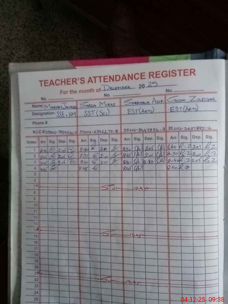 | CNIC | Full Name | Designation | R/C | Absence during last cal. month |