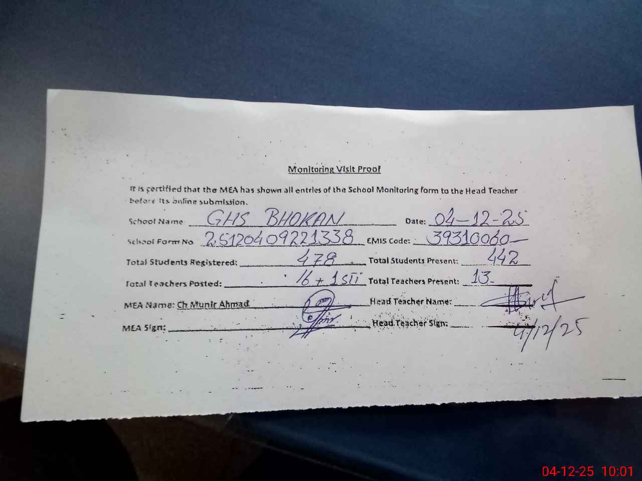 | EMIS Code: 39310060 | Name of School: GHS BHOKAN | |||