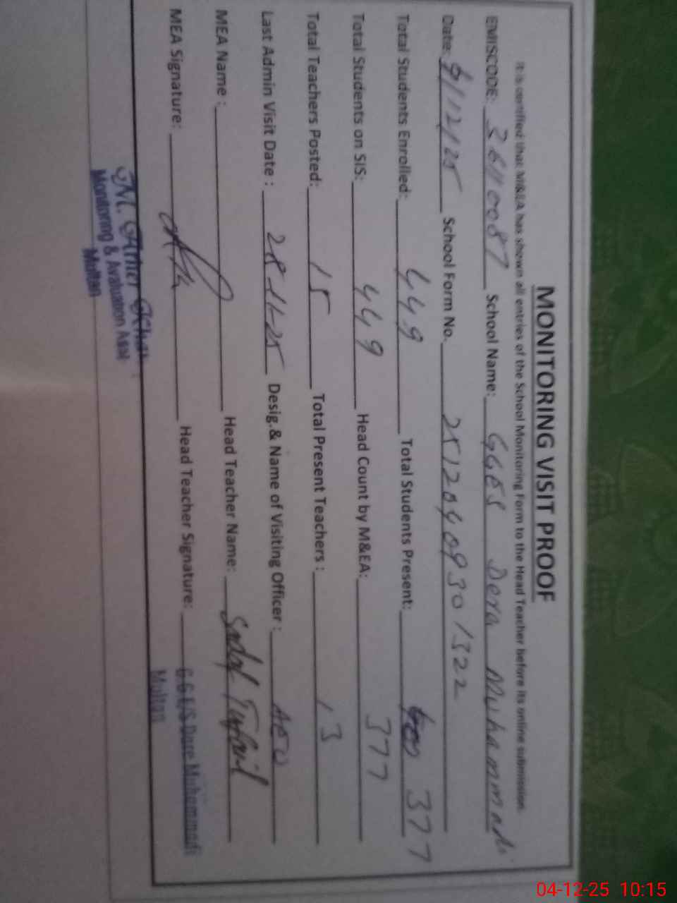 | EMIS Code: 36110087 | Name of School: GGES Dera Muhammadi Multan | |||