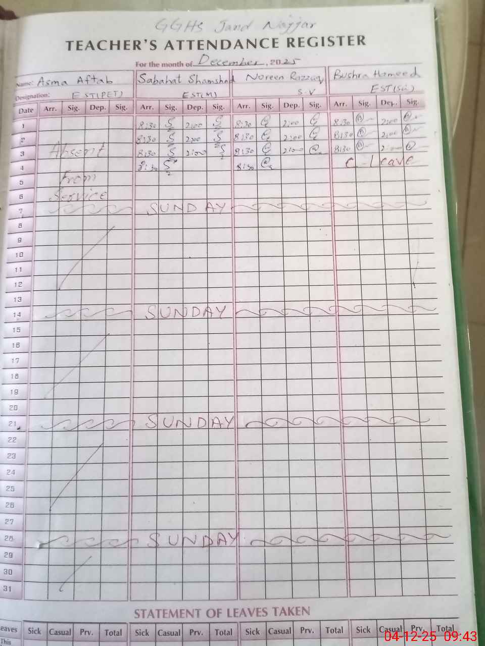 | CNIC | Full Name | Designation | R/C | Absence During Last Calender Month |