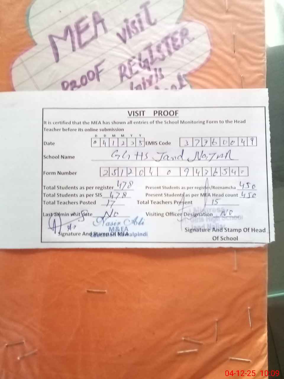 | Attendance Register | Head Teacher | MEA with School | Visit Proof |