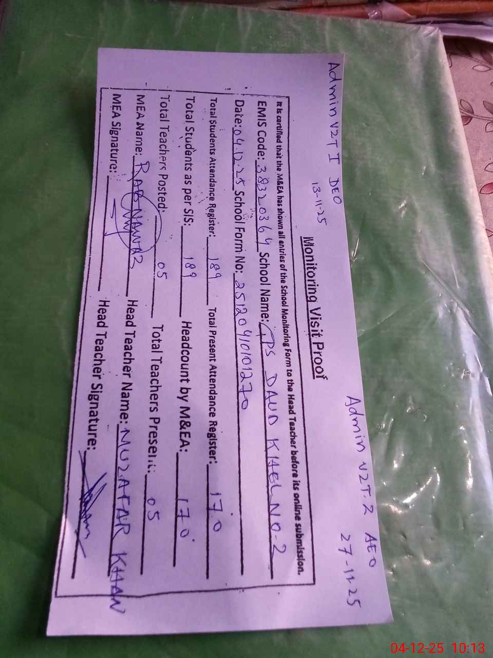 | Attendance Register | Head Teacher | MEA with School | Visit Proof |