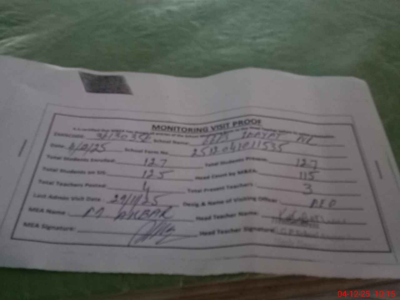 | Attendance Register | Head Teacher | MEA with School | Visit Proof |