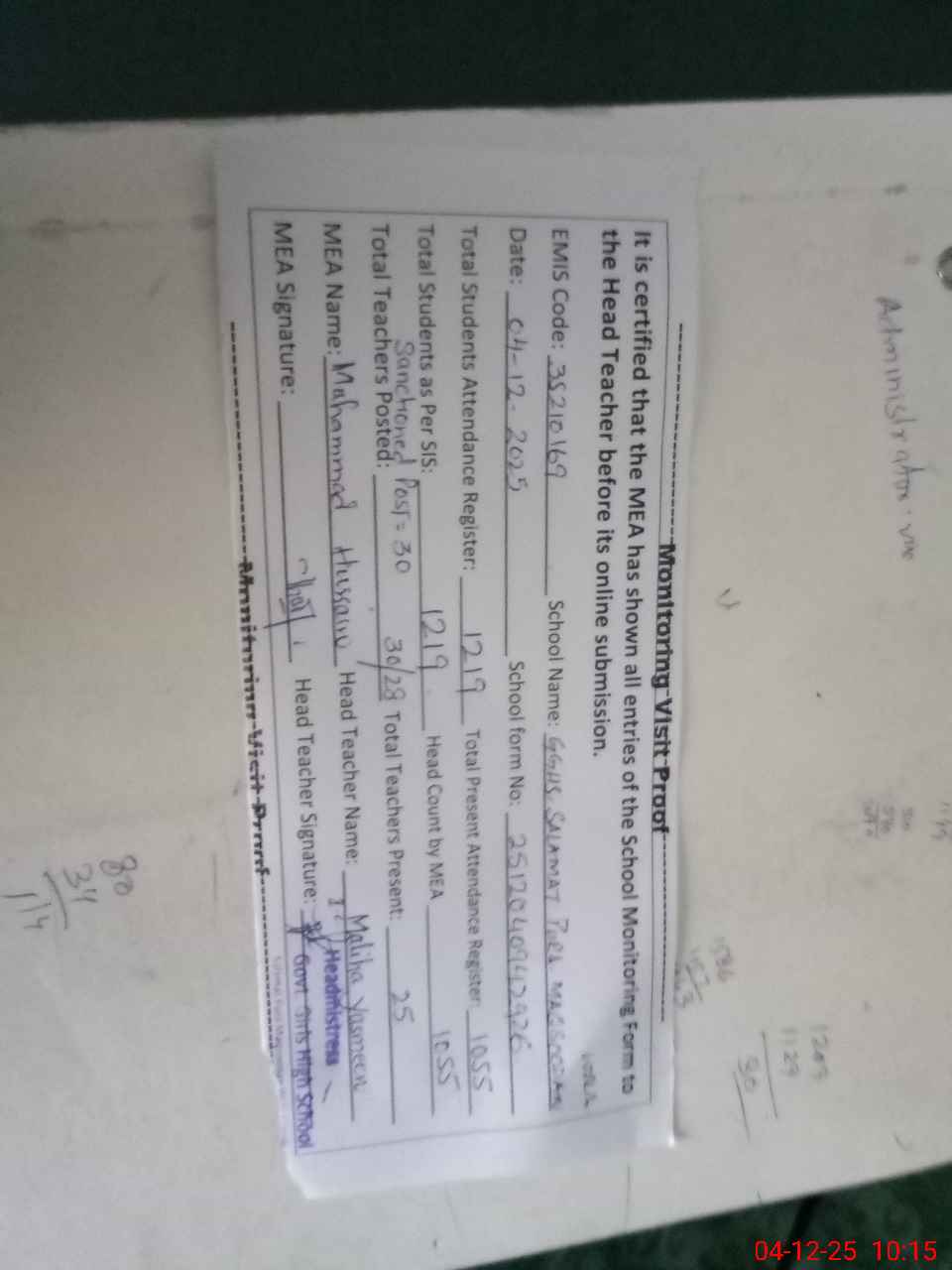 | Attendance Register | Head Teacher | MEA with School | Visit Proof |