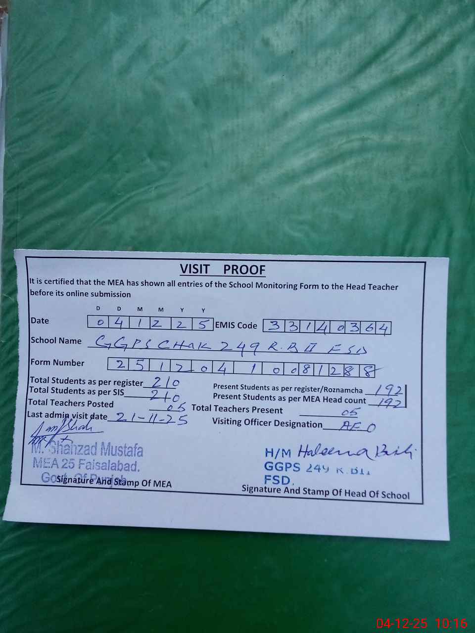 | Attendance Register | Head Teacher | MEA with School | Visit Proof |