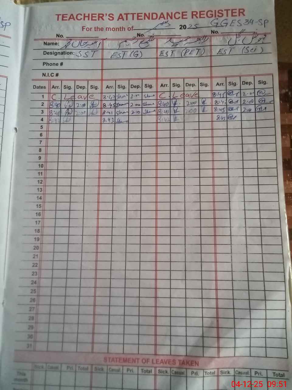 | CNIC | Full Name | Designation | R/C | Absence During Last Calender Month |