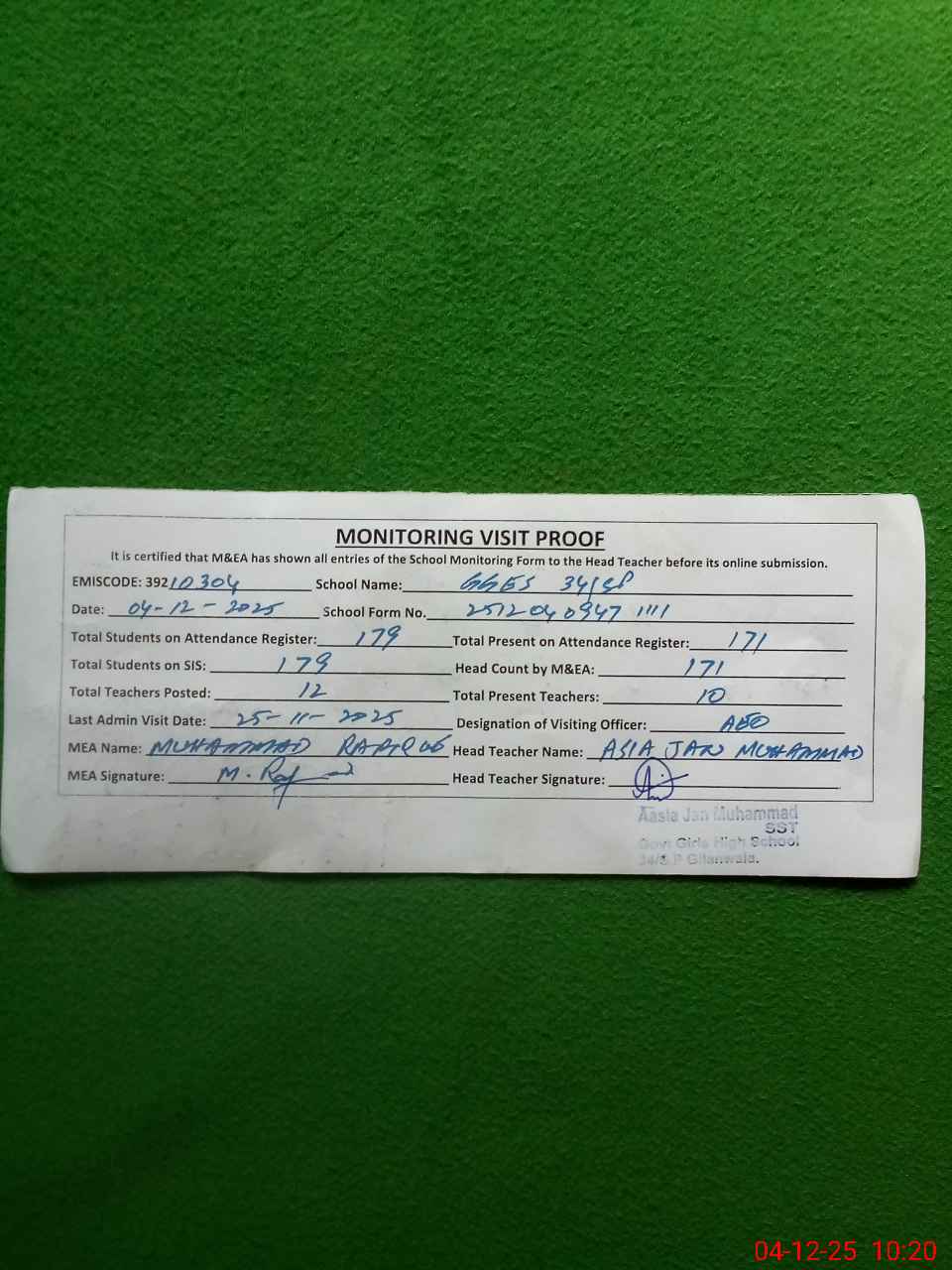 | Attendance Register | Head Teacher | MEA with School | Visit Proof |
