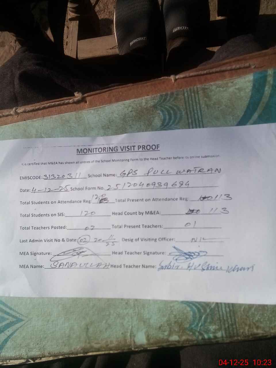 | Attendance Register | Head Teacher | MEA with School | Visit Proof |