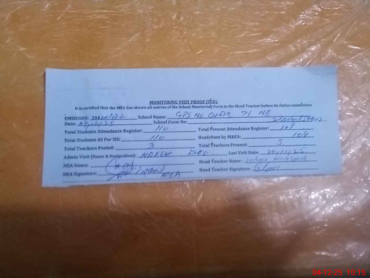 | Attendance Register | Head Teacher | MEA with School | Visit Proof |