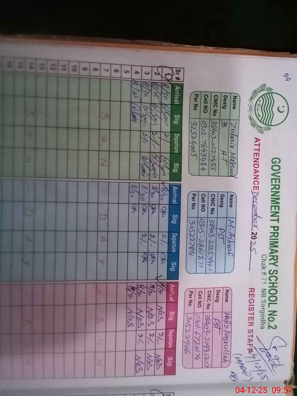 | CNIC | Full Name | Designation | R/C | Absence during last cal. month |