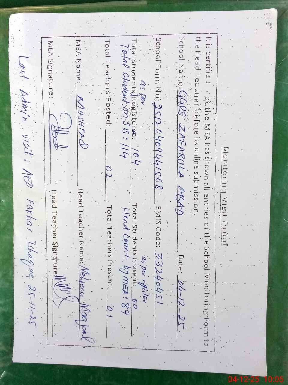| EMIS Code: 33240451 | Name of School: GGPS ZAFARULA ABAD | |||