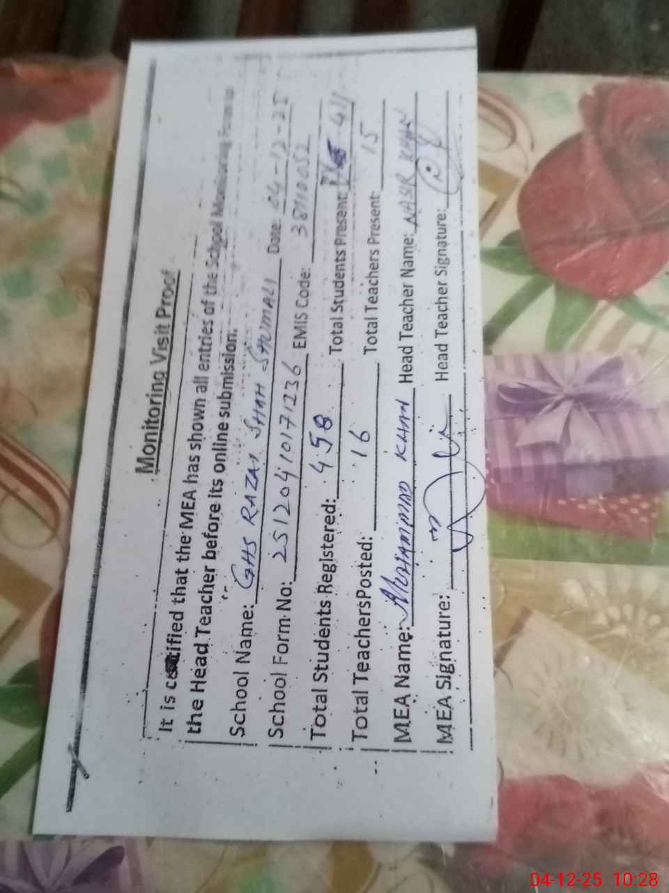 | EMIS Code: 38110052 | Name of School: GHS RAZAI SHAH SHUMALI | |||