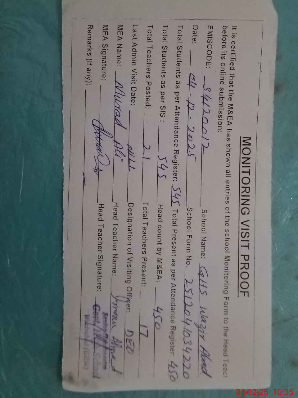 | Attendance Register | Head Teacher | MEA with School | Visit Proof |