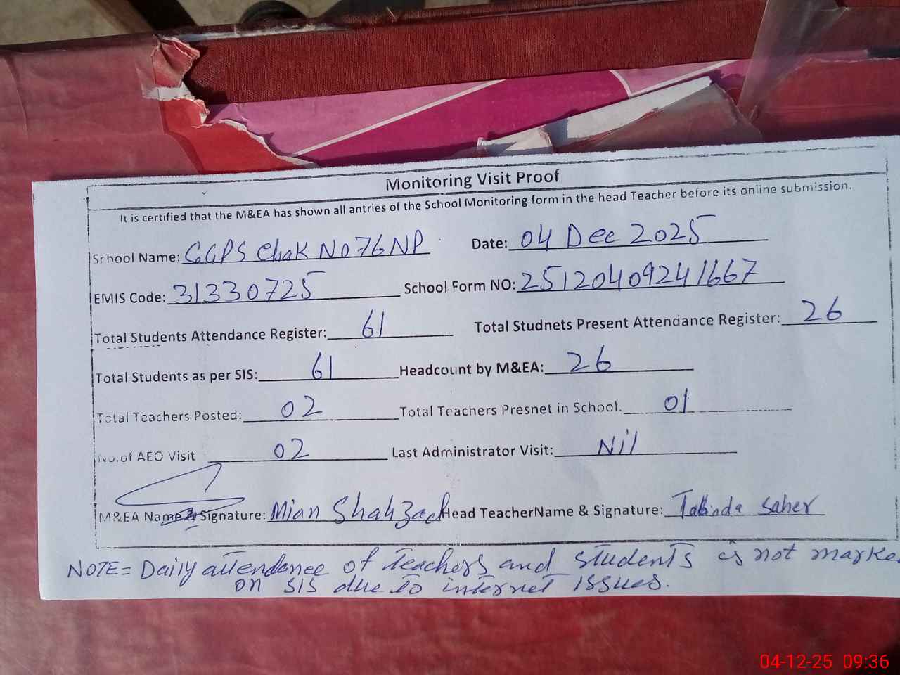| EMIS Code: 31330725 | Name of School: GGPS CHAK NO.76/NP | |||