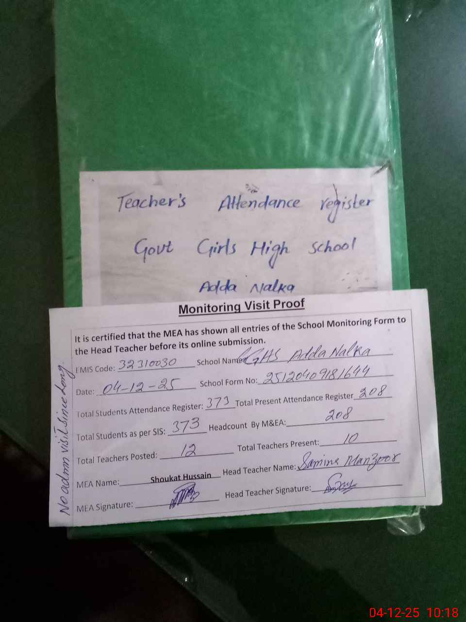 | EMIS Code: 32310030 | Name of School: GGHS ADDA NALKA | |||