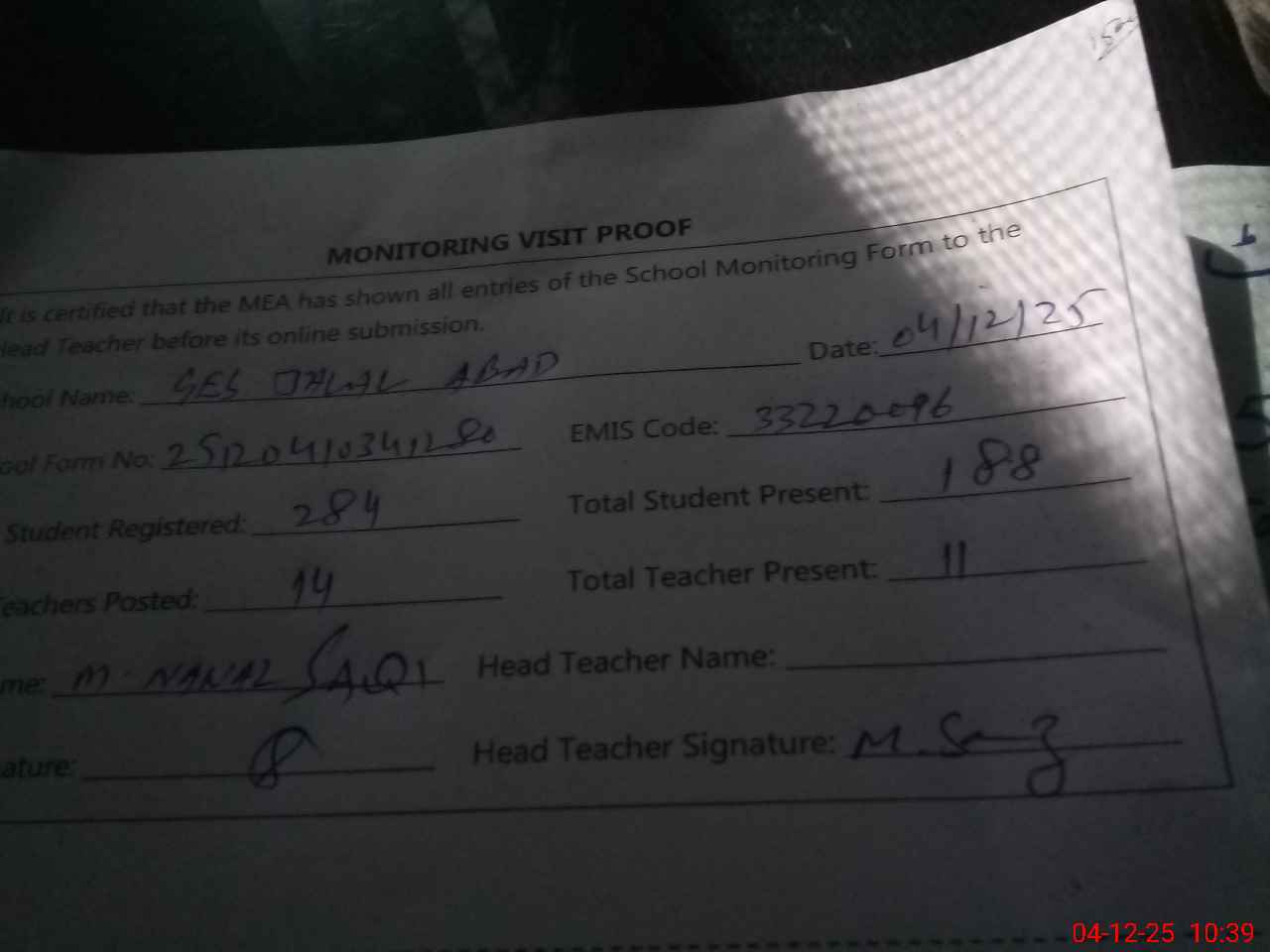 | Attendance Register | Head Teacher | MEA with School | Visit Proof |