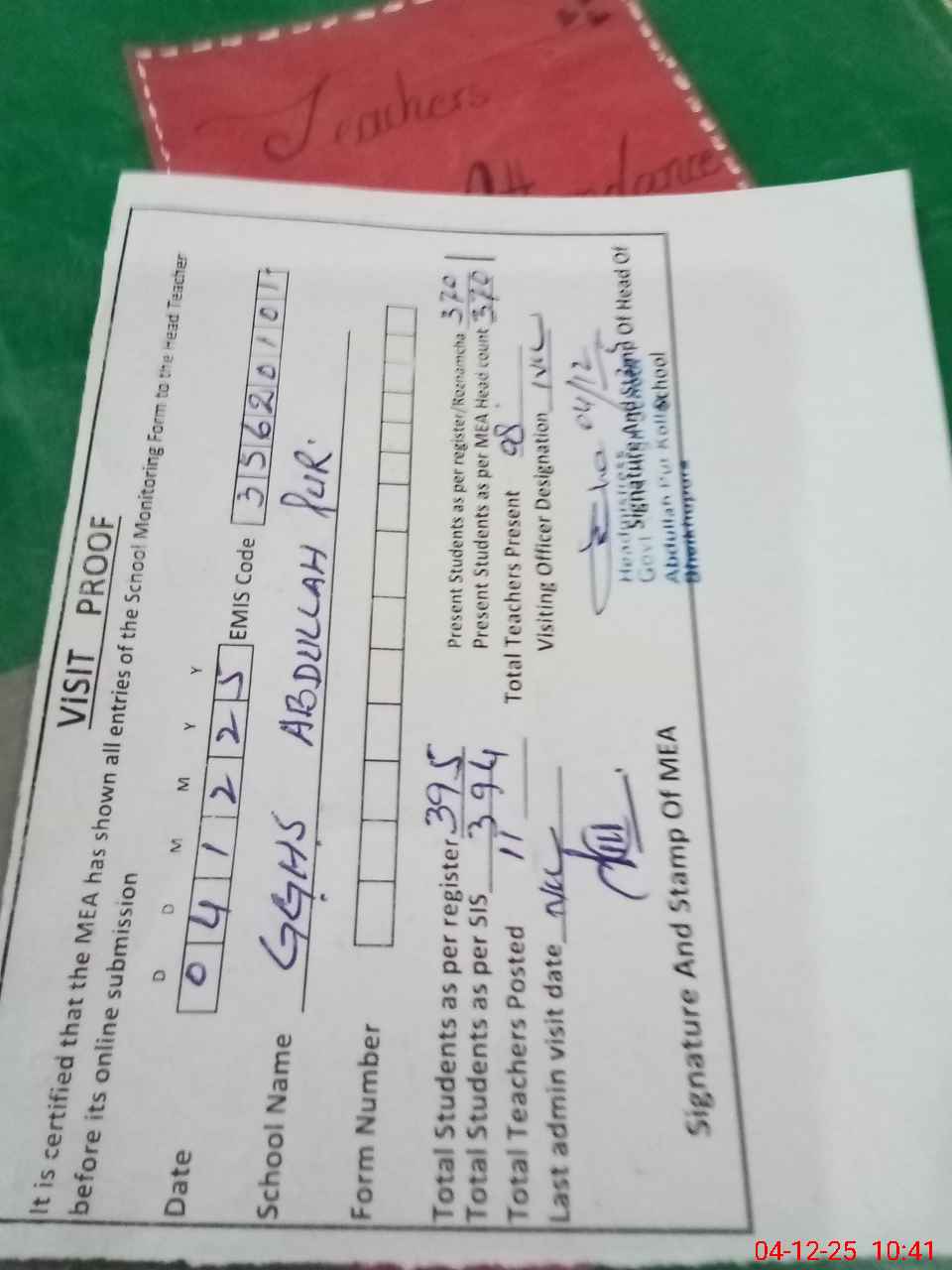 | EMIS Code: 35620101 | Name of School: GGHS ABDULLAH PUR KULAR | |||