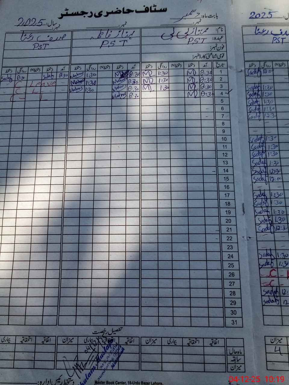 | CNIC | Full Name | Designation | R/C | Absence During Last Calender Month |