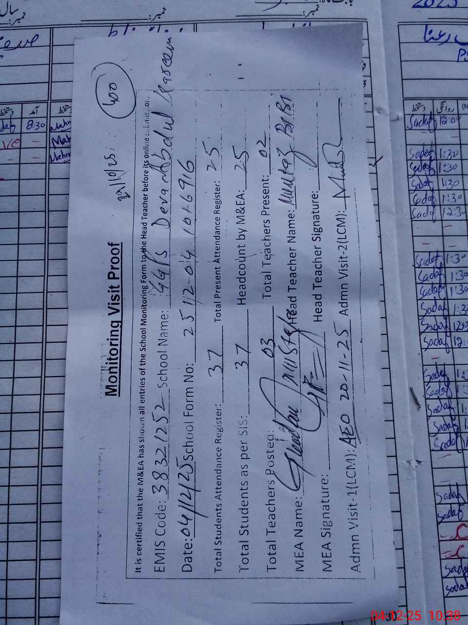 | Attendance Register | Head Teacher | MEA with School | Visit Proof |