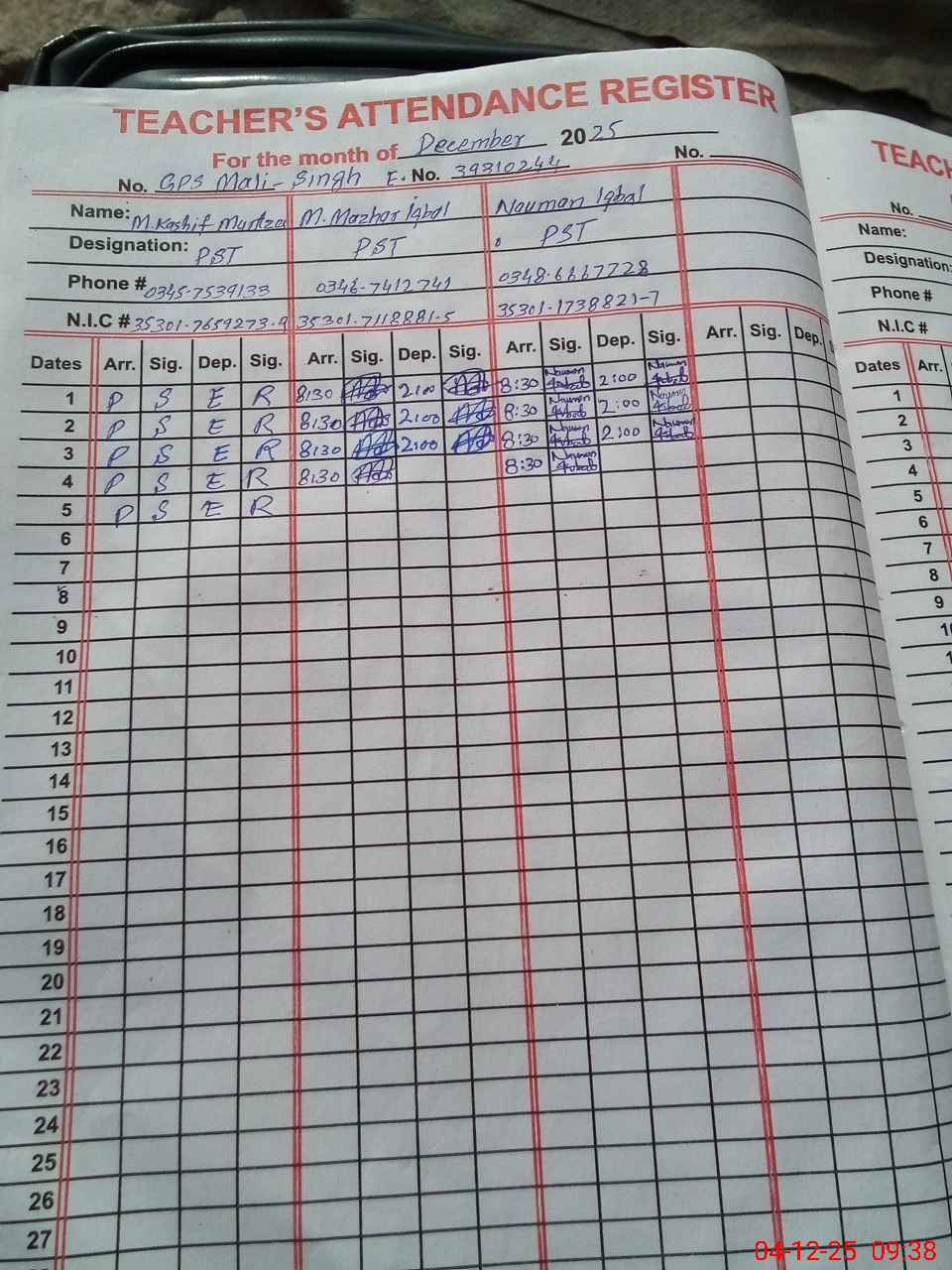 | CNIC | Full Name | Designation | R/C | Absence During Last Calender Month |