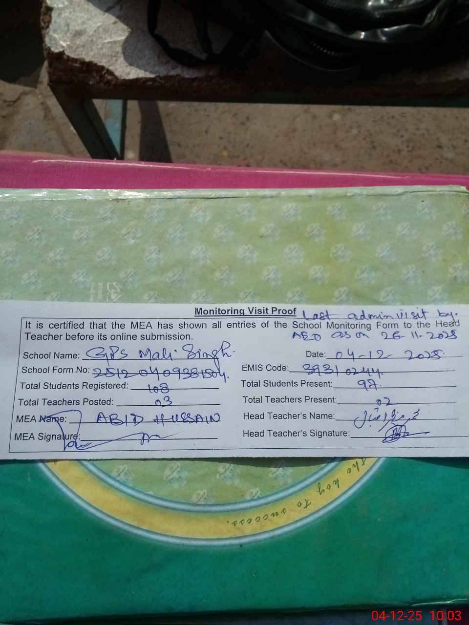 | Remarks (Use Separate Page if Required): Last Administrator visit by AEO as on 26-11-2025 | |||||