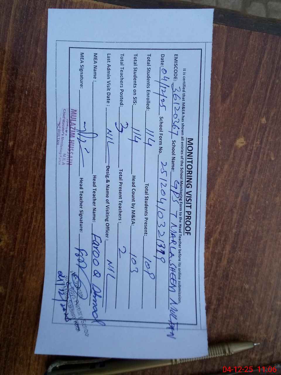 | Attendance Register | Head Teacher | MEA with School | Visit Proof |