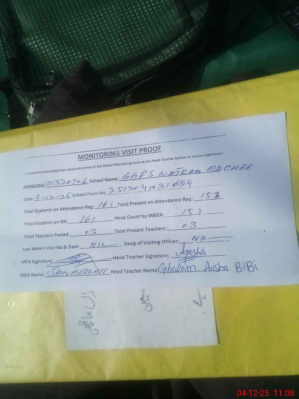 | Attendance Register | Head Teacher | MEA with School | Visit Proof |