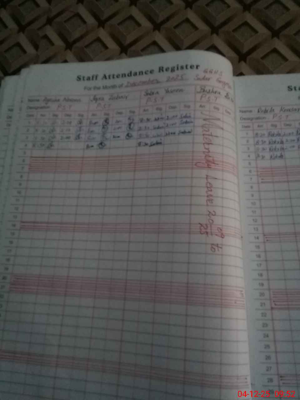 | Leave | Duty | Absent | Maternity | Medical | Ex- Pak |