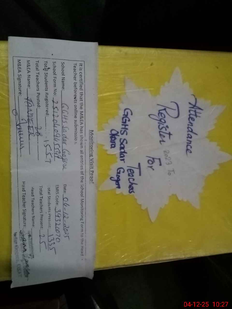 | Attendance Register | Head Teacher | MEA with School | Visit Proof |