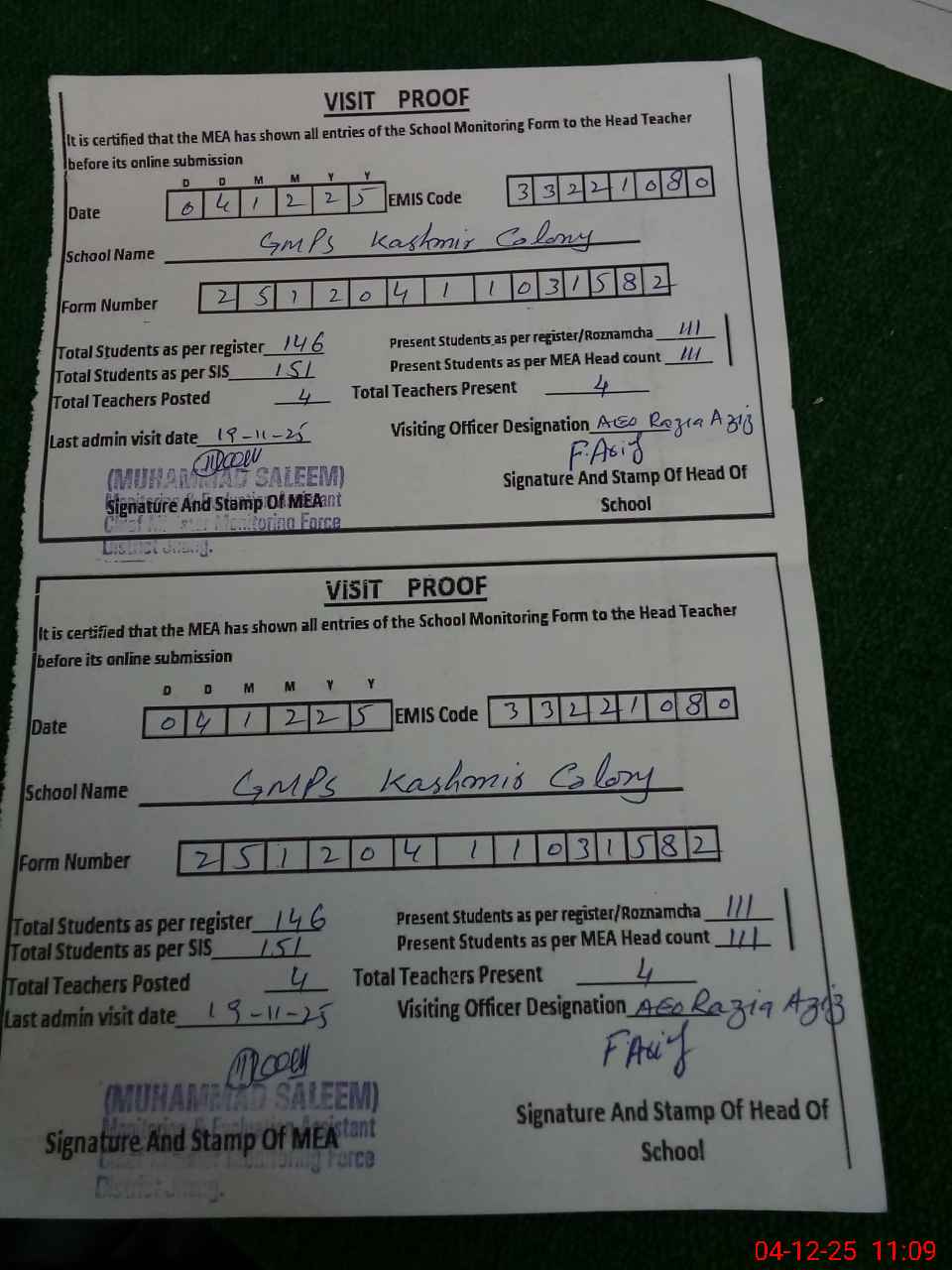 | Attendance Register | Head Teacher | MEA with School | Visit Proof |
