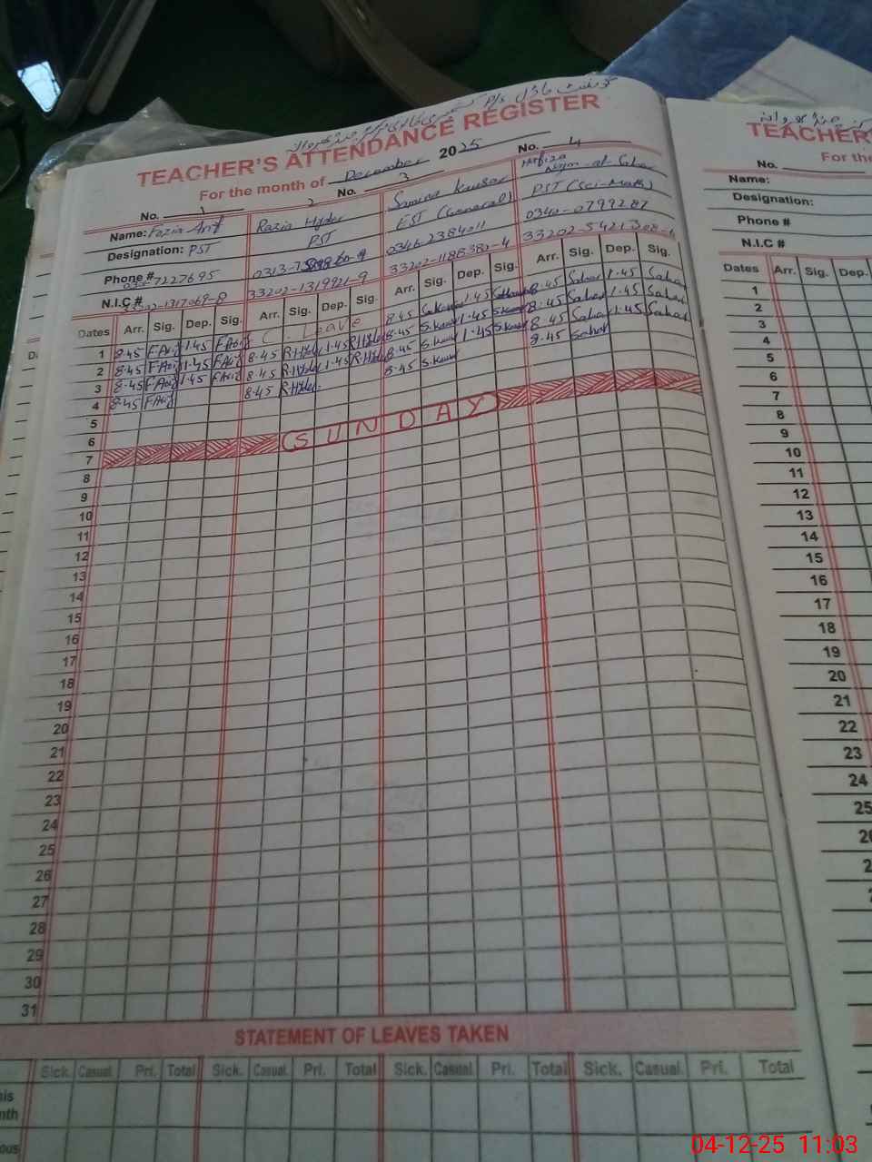 | CNIC | Full Name | Designation | R/C | Absence During Last Calender Month |