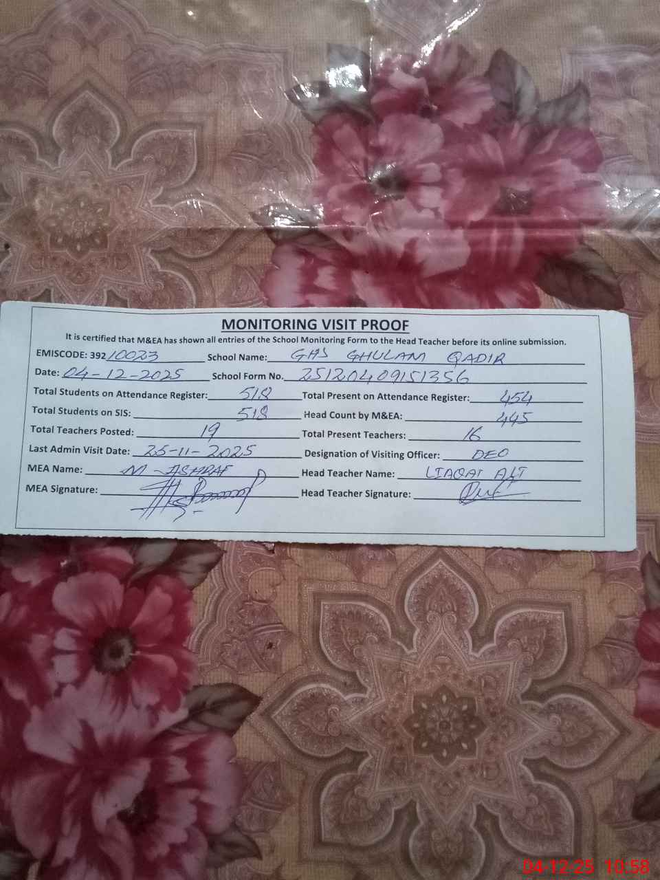 | EMIS Code: 39210023 | Name of School: GHS GHULAM QADIR | |||